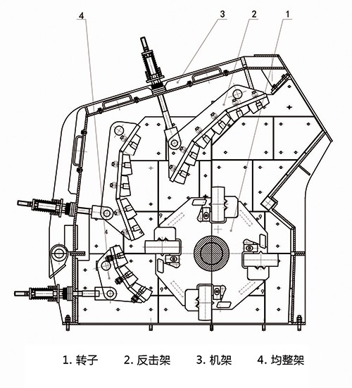 PF系列反擊式破碎機是一種利用沖擊能來破碎物料的破碎機械。機器工作時,在電動機的帶動下,轉子高速旋轉,物料進入板錘作用區時,與轉子上的板錘撞擊破碎,后又被拋向反擊裝置上再次破碎,然后又從反擊襯板上彈回到板錘作用區重新破碎,此過程重復進行,物料由大到小進入一、二、三反擊腔重復進行破碎,直到物料被破碎至所需粒度,由出料口排出。